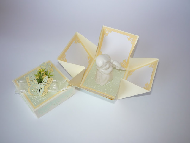 Dėžutės išmatavimai 7x7cm. Dėžutėje yra vietos sveikinimui-palinkėjimui įrašyti, kišenėlė pinigėliams įdėti, vieta datos lapeliui su Pirmosios Komunijos data.